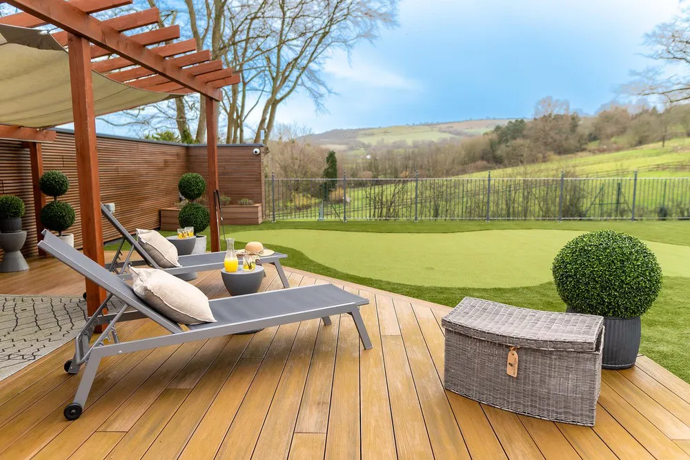 And there’s more, heaps more. Wander down the garden to the spa hall; inside there’s a heated pool, hot tub, sauna, changing/shower rooms, a kitchenette, and a comfy seating area. Up above there’s a large roof terrace where you can soak up the Somerset sun and perfect your skills on the putting green.